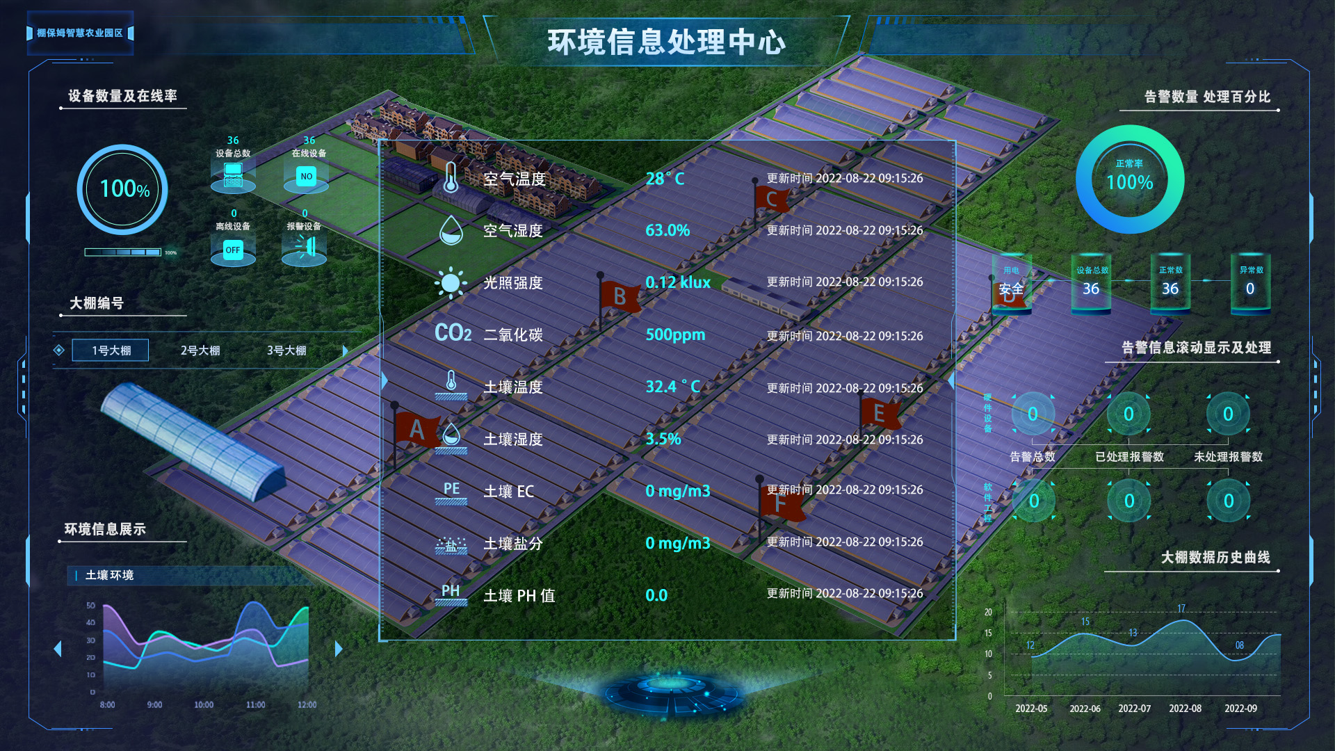 通過天地圖、虛擬園區(qū)、智能大棚等園區(qū)管理控制板塊,可以直觀立體的展示園區(qū)分布、大棚數(shù)量、種植面積以及物聯(lián)網設備在線等情況,并可以具體查看某個大棚的編號、建棚日期等基本信息以及棚內農作物的實時生長情況。